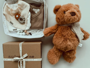The Classic Teddy Gift Box is a timeless collection of practical and beautiful essentials, carefully chosen for new and expectant mothers. Each item is made to be both useful and cherished, with a focus on softness, quality, and thoughtful detail.